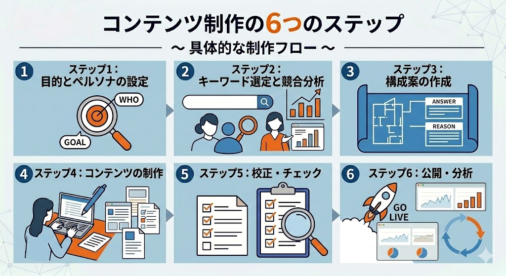 ここでは、SEO記事の制作を例に、6つのステップで紹介します。