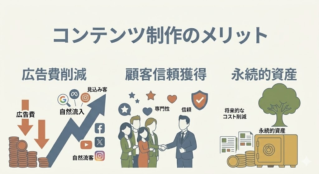 一度作ったコンテンツは、広告費をかけ続けなくても検索エンジンやSNSから継続的に見込み客を呼び込んでくれます。