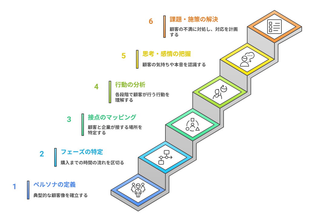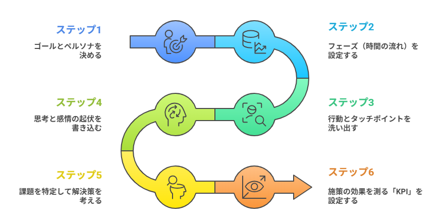 ここでは、初めてカスタマージャーニーマップを作る方でも迷わず作れるよう、具体的な例を挙げながら6つのステップで解説します。