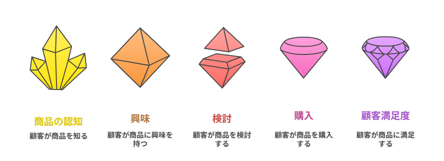 | フェーズ(ステージ) | 購入までの時間の流れを区切ったもの | 認知 → 興味・関心 → 比較・検討 → 購入 → 利用 |