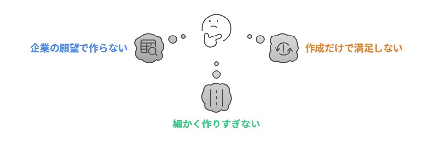 カスタマージャーニーマップを初めて作成する際、やりがちな「3つの落とし穴」があります。これらを避けるだけで、マップの質は格段に上がります。