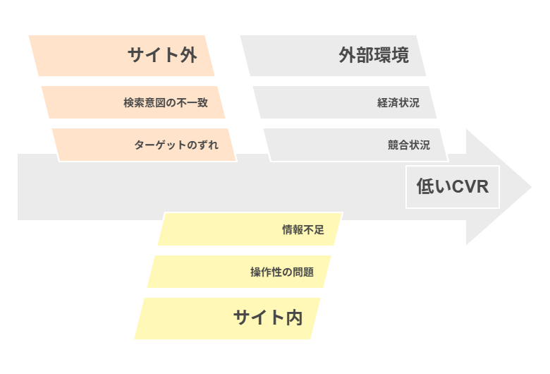 例えば、広告のターゲティングが広すぎると、「今すぐ客」ではない情報収集目的のアクセスばかりが増え、結果としてCVRは低下します。