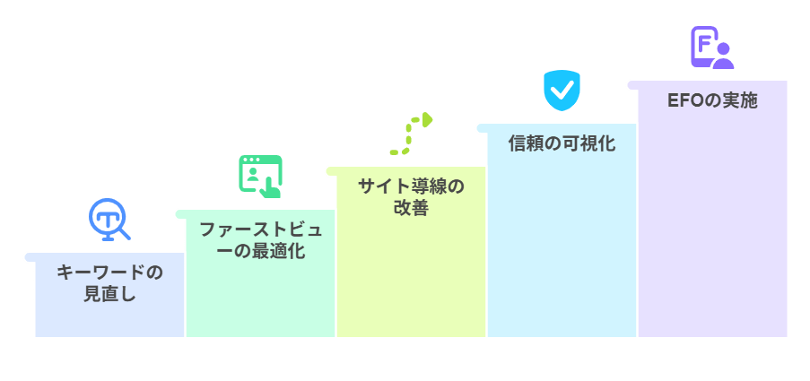 - 改善には「キーワード」「ファーストビュー」「導線」「信頼性」「EFO」が重要