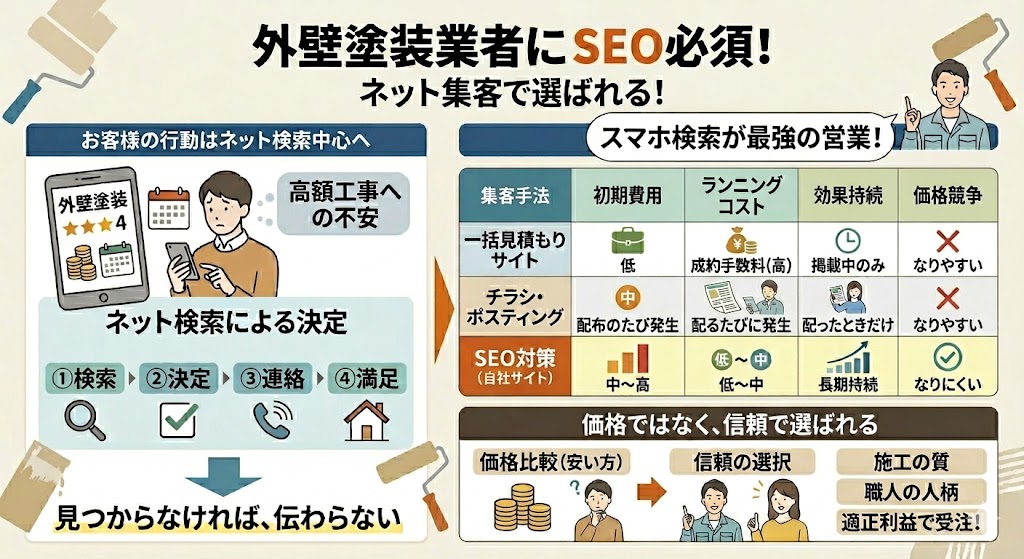 外壁塗装業界でも、チラシや飛び込み営業だけに頼らず、インターネット検索からの集客に力を入れる業者が増えています。