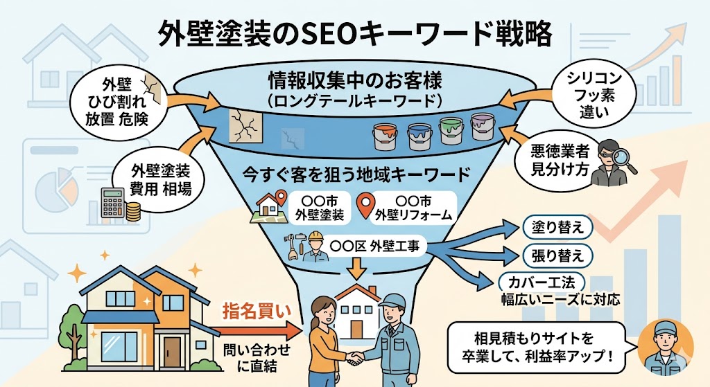 | 費用系 | 「外壁塗装 費用 30坪」 「外壁工事 相場 サイディング」 「〇〇市 外壁塗装 補助金」 | 料金ページや費用解説記事で丁寧に回答 |