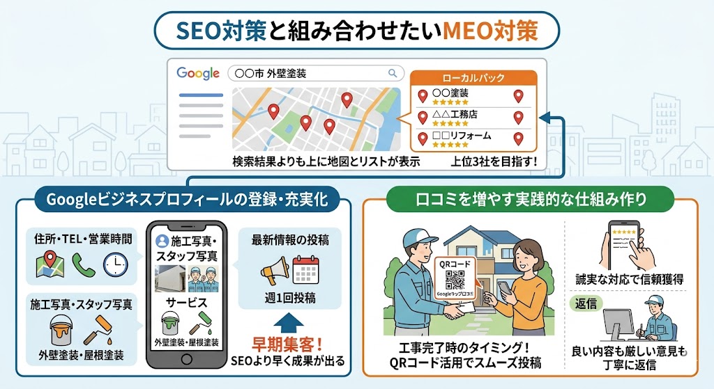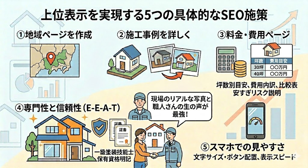 「〇〇市の外壁塗装」「△△区の外壁工事」のように、対応エリアごとに専用ページを作ることで、Googleは「この会社は〇〇市に詳しい」と判断し、地域名を含む検索での上位表示が狙いやすくなります。