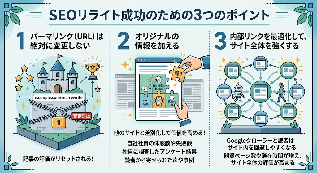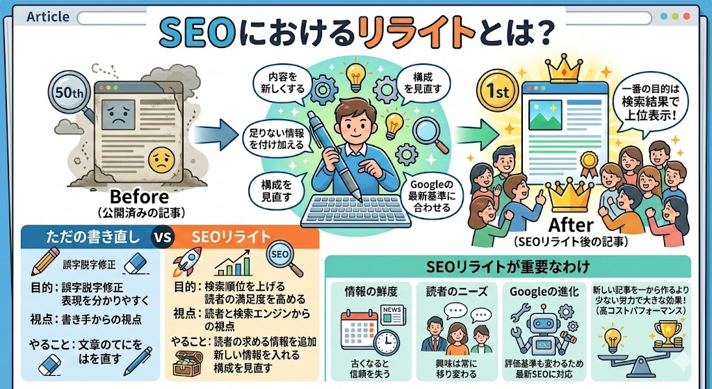 リライトは、こうした変化に対応し、記事の価値を保つために不可欠な作業なのです。