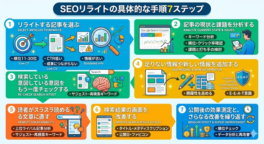ここからは、具体的なリライトの手順を7つのステップに分けて解説していきます。