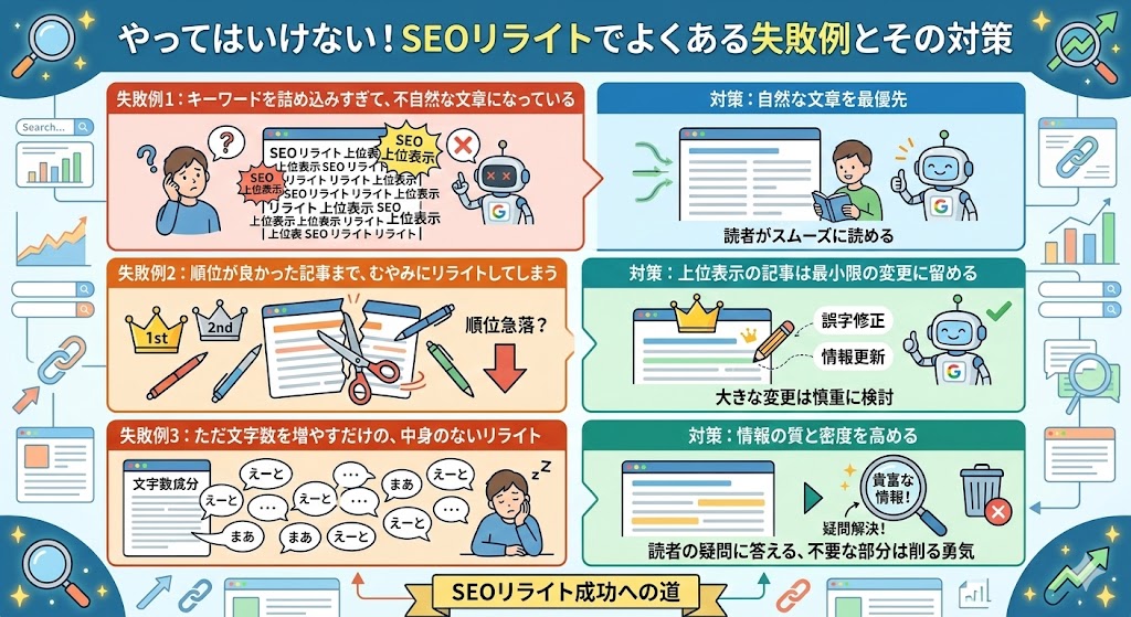 良かれと思ってやったリライトが、逆に順位を下げてしまうこともあります。ここでは、初心者が陥りがちな失敗例とその対策を3つご紹介します。同じ轍を踏まないように、しっかり確認しておきましょう。